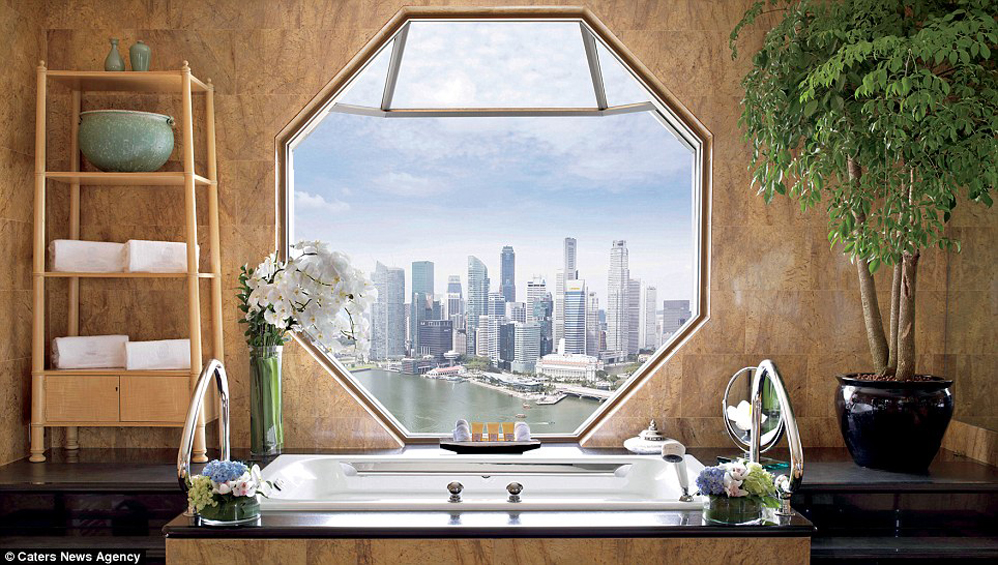 新加坡丽思卡尔顿酒店洗手间,可以欣赏到新加坡的天际线和滨海湾