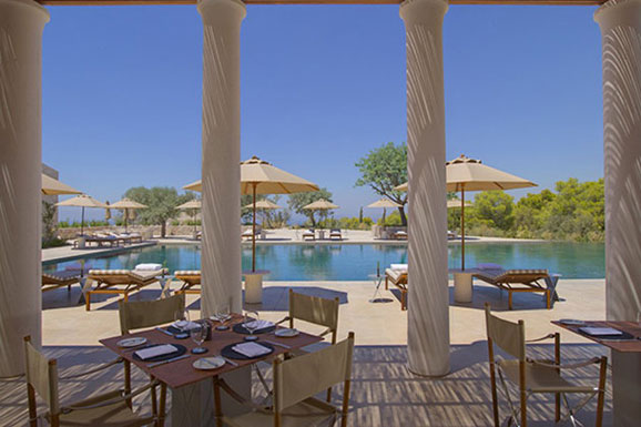 Amanzo'e酒店的客房干净整洁,房内的床铺和私人泳池都用精致的大理石墙面装饰。所有的客房皆分布在郁郁葱葱的山坡上。从这些房间里,你能观赏到绝佳的爱琴海景色和迷人的伯罗奔尼撒乡村。