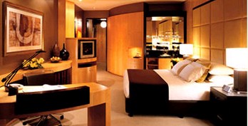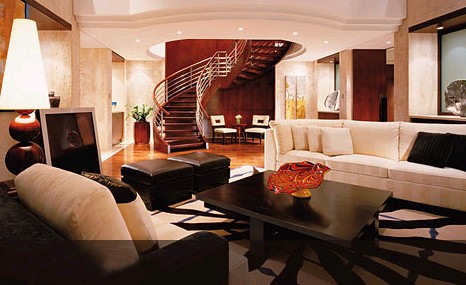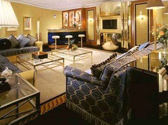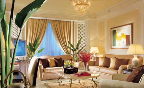 总统套房面积共有435平方米,异域风味浓厚的内部设计采用了传统的胡桃木、皮草、天然纤维制品和意大利大理石等材料,与现代原创艺术作品及等离子电视等时尚元素完美结合,并且配有家庭影院设备、高级音响,传真机、笔记本电脑和两套带有小电视的极可意水流按摩浴缸。