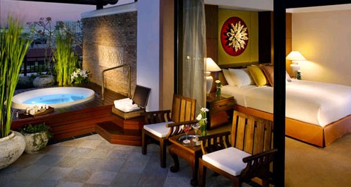 要享受泰皇帝豪式享受,可由 07 年底开幕的香格里拉酒店开始。酒店坐落城市中心,但设计却巧妙配合环境,像置身 Resort 的格局。酒店三间套房位于酒店顶层,当中最大的总统套房,推门便发现门口旁九宫格般放置众多泰国艺术品。房间装潢原是泰国古时蓝纳王朝的复古风格,五间客房合为一体,还可以在独立露台环看城市景致,总统套房果然富丽堂皇,别树一格。