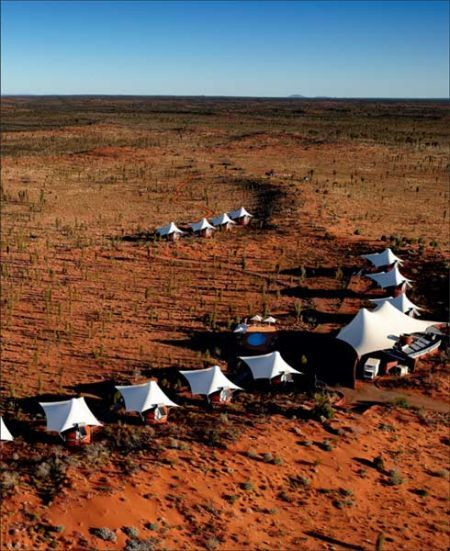 乌鲁鲁堪称澳大利亚最完美最壮丽的遗迹,东经131°酒店的15顶白色帐篷就点缀在乌鲁鲁一侧空旷的荒野上