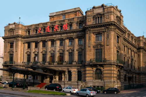在中山广场周围10座欧式建筑中,最显赫的是“大和旅馆”,即如今的大连宾馆。从1909年开始,在大连、沈阳、长春、哈尔滨等地,日本侵略者先后建造了7座“大和旅馆”,成为“满铁”连锁宾馆。大连“大和旅馆”建成后,堪称当时东北地区最大、最豪华的宾馆。当时宾馆的房间内就都有冷热水,2楼、3楼的房间有独立的卫生间,在宾馆的5楼室外平台上,还有一个顶楼庭园,客人可在此一边享受美食,一边将广场周围的景色尽收眼底。入住大和旅馆的人非富即贵,许多日本军政要人、财阀巨贾以及满清遗老遗少、伪满皇亲国戚在这里过着纸醉金迷的生活。大连宾馆外观古典大气,但细节处却不失婉约秀美,探出很远的金属弧行遮雨蓬更是默默体现了欧洲传统宾馆的关怀体恤之情,现在宾馆内的华丽的水晶吊灯,光亮的铜质的插销和把手仍然沿用是初建时的。