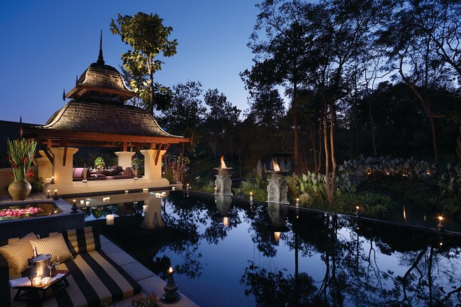 2 泰国清迈的四季酒店:四室复式别墅内有一个凹陷的日式10人餐桌,平时也可作为一个泰式按摩厅使用。