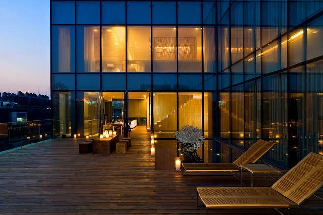 5 北京瑜舍酒店顶层公寓:酒店99套房间中最大的是一居室的顶层复式公寓,图中为复式公寓内的起居室。在寒冷季节,可使用地热采暖,也可以在橡木浴缸里泡澡。 ![]() |