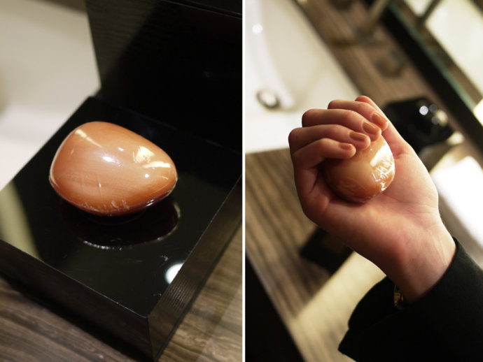 这一块香皂让我们每个人都爱不释手。据说是Giorgio Armani在沙滩散步的时候捡到的一块小石头,当时觉得握在手心特别舒服,想把这个灵感带到酒店,于是有了这块香皂。大师的灵感和最终的实现,完成地如此完美。
