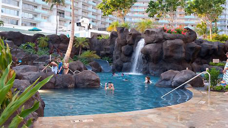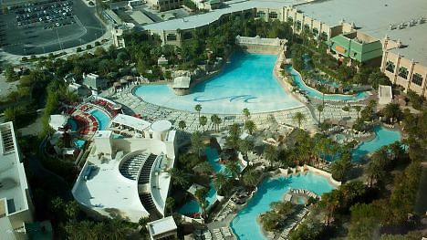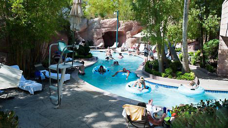 其拥有河流、瀑布、洞穴、棕榈树以及五个游泳池,米高米的水池是拉斯维加斯市最迷人的水池。河畔水池(如图所示)的沿途有很多瀑布与洞穴。水池不但是成人的最爱,也是儿童的向往之地。