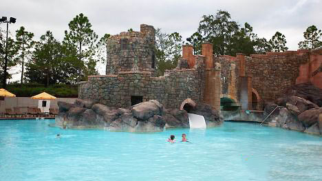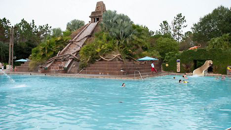 迪斯尼的克罗纳多·斯普林斯度假酒店拥有巨大的水池及滑水道等设施,此外在每个建筑群周围也会有一个小型的静谧水池。