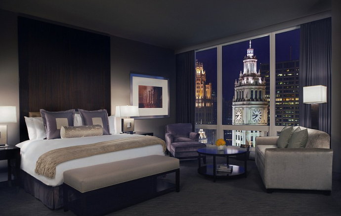10.在芝加哥五星级特朗普酒店豪华房间内,可以看到箭牌大厦钟楼。