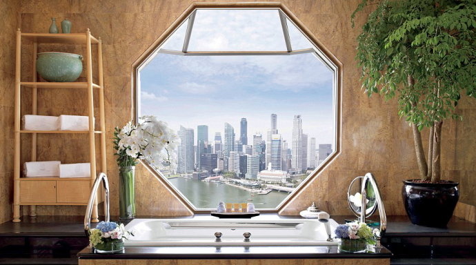 2.在新加坡丽嘉酒店丽嘉套房内洗澡的客人可享受欣赏新加坡天际线和滨海湾美景的乐趣。