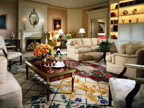 布局:在这间套房里就像是在史密森尼美国博物馆的小侧房里一样。室内有乔治 F肯尼迪赠送的小木质摇椅,它放置在火炉和艾森豪威尔桌子之间。卧室的设计大小适度、布局沉稳,你可以在麦克阿瑟将军曾用的桌子上起草一份演讲。这个桌子可以追溯到阿瑟将军与他的夫人在此居住那一年。奇怪的是,窗户外的风景只是普通的不引人注目的市中心,而且窗户安装的是并不防弹的玻璃。这间套房内有四间卧室,每一间都配有一把钥匙。