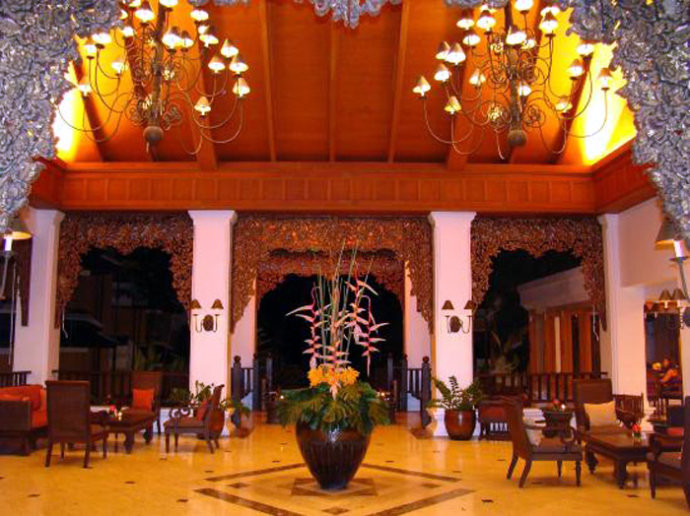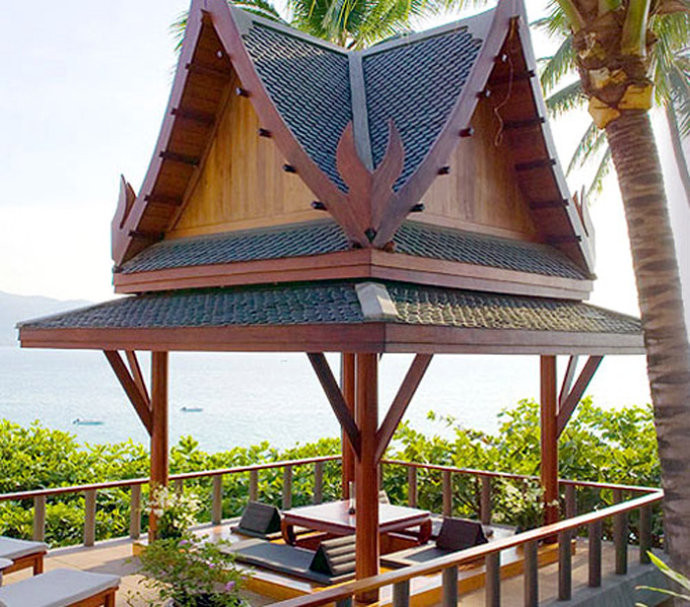 酒店的设计很别致,传统的泰式建筑风格中融入了浓密的绿色景观中,夜晚是最为华美的,灯光从海滨向上延伸至山顶的餐厅。房间顺着由上而下的山体走势整齐地排列两旁。