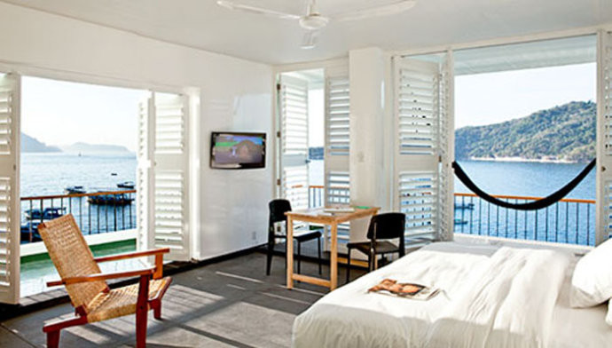 酒店房间数量不多,6间套房,30个房间,任何一间都有一个私人露台和吊床,浴室里用的是美国Dr. Bronner天然香皂。日落套房的外边是一个私密的花园,吹着阿卡普尔科海风,感觉像是生活在树屋里。
