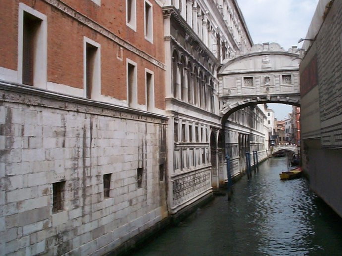 这座巴洛克风格的石桥横跨于Rio di Palazzo运河之上,外观看似精致迷人,但其渊源却相当的黑暗。建于17世纪早期,这座由白色石灰石建成的桥连接着总督府和威尼斯监狱,密封式的通道是古代法院向监狱押送犯人的必经之地,同时通道内的小窗子也是犯人能够最后一瞥外面世界的地方,所以被称作为“叹息桥”。讽刺的是,如今,叹息桥对情人而言还有一个特殊的意义,相传在日落之时,如果情侣能够在桥下亲吻,那么将会永浴爱河。