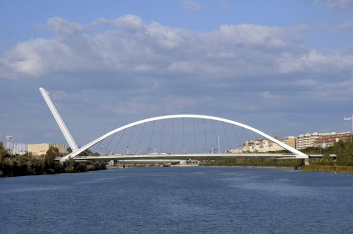 这座桥是由西班牙著名建筑师圣地亚哥。卡拉特拉瓦为1992年塞维利亚世界博览会设计建造的,那次梦幻式的世博会是为了庆祝哥伦布发现新大陆500周年。这座斜拉桥高466英尺,横跨于瓜达尔基维尔河上,衔接了塞维利亚旧城区和卡图哈岛。相传,哥伦布在计划横跨大西洋时,曾经居住在该岛上。