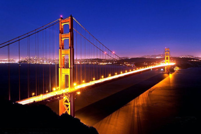 1937年建成的金门大桥也许是加利福尼亚州最壮观的地标性建筑,每年吸引了1000多万游客。大桥横卧在美丽的金门海峡,最大跨度达4200英尺,桥身颜色呈“国际橘”,使得大桥在金门海峡常见的大雾中显得更为醒目。大桥常常出现在众多影片中,如《马耳他之鹰》,同时它也是无数作家笔下的宠儿。