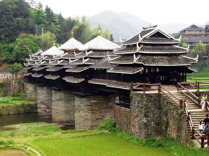 在中国广西省,侗族人民建造了传统的风雨桥,用来连接相邻的村庄,同时也为人们提供了聚会、休息和交谈的场所。三江县的程阳风雨桥横跨林溪河,是一座木石结构的大桥,建于1916年,桥上建有5座塔式桥亭,飞檐高翘。桥上的壁柱和瓦檐上雕刻着精细复杂的绘画,富丽堂皇。程阳桥中间有一块大理石碑,上面刻着中国著名历史学家和学者郭沫若的题字,郭沫若在游览了程阳桥之后大为叹之,并为大桥写了一首诗。