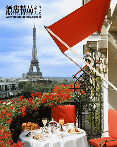 拥有埃菲尔铁塔最佳观赏角度并且能够俯览180°全景巴黎的埃菲尔露台套房也是最值得推荐的。据说这类客房的设计灵感来自于窗外高耸入云的埃菲尔铁塔和巴黎一望无际的蔚蓝天空。整个套房以咖啡色为基调间以极其清新淡雅的天蓝色及米色作为反衬。加上房间的采光极好,每当清风徐来则令人顿生飒爽之感。而那被人津津乐道的埃菲尔铁塔景观,则被设计师灵活的放置于房间的各个角落,甚至干脆在窗边镶嵌了画框,将铁塔“框”在其中,犹如挂在墙壁上的一幅油画。更有甚者,就连你在浴缸中沐浴的时候都可以看到这一美不胜收的风景。当然你尽可以大胆的享受,因为这种享受是在绝对私密的前提下进行的。