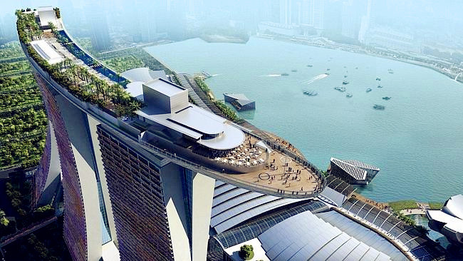滨海湾金沙酒店是一家耗资50亿美元的综合度假胜地,共有55层,楼顶上还建有一个巨大的泳池。