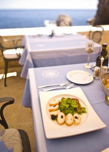 面朝大海,帆船点点,在海浪声中点一份海鲜,如蘸着鱿鱼酱的黑鲈,或加着当地橄榄油和醋的龙虾。20号和22号餐桌就在栏杆旁边,可看到最美的海景。