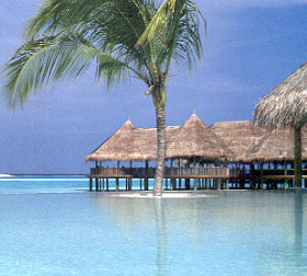 马尔代夫是一个有着1000多个小岛的岛国,这家酒店的客房设计具有浓厚的当地风情,都是一座座带有草屋顶的水上小阁楼,恰似星罗棋布的岛屿。