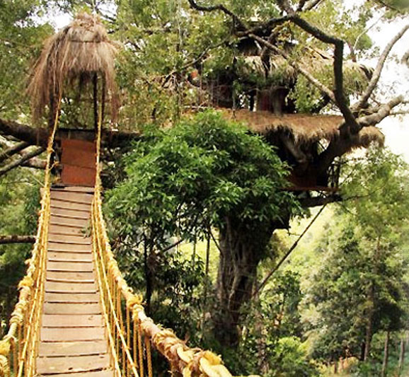 克拉拉坐落在瓦亚那德热带雨林的一棵榕树上,由当地的邦竹及椰子壳纤维搭建,房屋与房屋由绳索吊桥连接起来。想象一下,当绳索把你从地面带到高达60到115英尺的小屋时,该是多么刺激啊!为了增强环保意识,所有旅客都需要栽种一棵树苗。