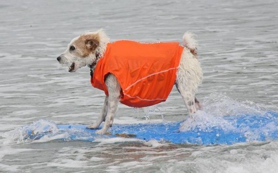 教狗狗冲浪在美国加利福尼亚州的洛伊斯科罗纳多湾度假村,客人们的宠物狗可以学习如何冲浪。经过科罗纳冲浪学校的专业教练的培训,喜欢玩水的宠物狗能够成为狗狗家族的冲浪高手。