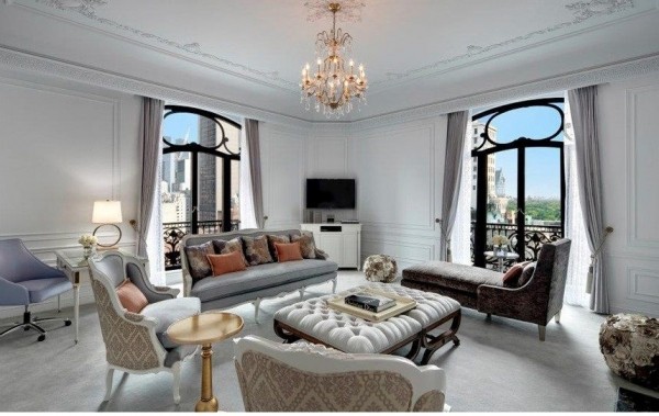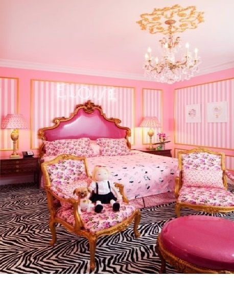 7 纽约广场酒店的埃罗依套房是由贝齐·约翰逊设计的,灵感来源于一位虚幻的小女孩,埃罗依,与凯·汤普森的书中一位主角同名。酒店的特色是散发出粉红色灯光的吊灯,并且能在墙上投影出埃罗依的名字。