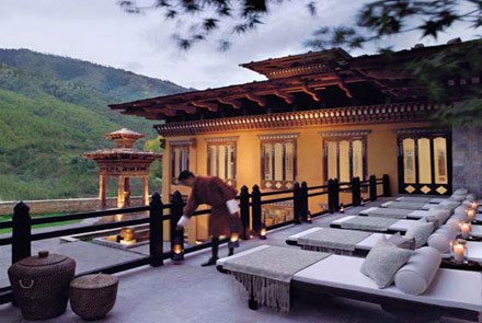 喜马拉雅王国———不丹,传说中的雷、龙之地。群山围绕之中的不丹悠远娴静,在逐步对外开放的同时,坚守着尊崇大乘佛教的文化传统,使得这个倚靠着喜马拉雅的王国更显神秘,成为众人心中向往的圣地。泰姬扎西位于延布市区内的重山之中,远远望去辉煌而雄伟。与其说是酒店,不如说是一座金色宫殿。作为不丹最为高档的豪华酒店,泰姬扎西在引进现代化设备的同时,依然保持着自己的文化传统。也正是因为这种深厚的文化底蕴与宗教传统,使得不丹能够保持其神圣与经久不衰的吸引力。