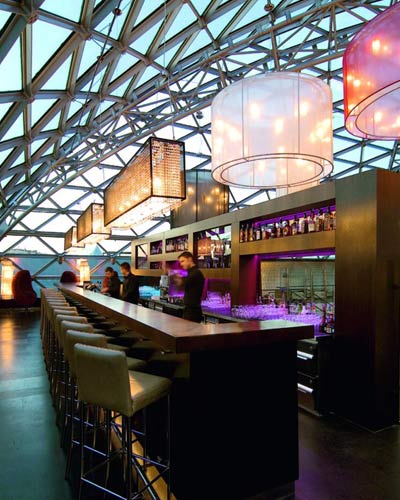 与这间总统套房同样身处酒店顶层的,是一个空中酒吧,它由玻璃和钢材建造,这种现代结构使得此处不需要过多的辅助灯光,全年都可借助自然光,即使是在夜里,站在这里,依然可以360度环视整个红场和克里姆林宫。