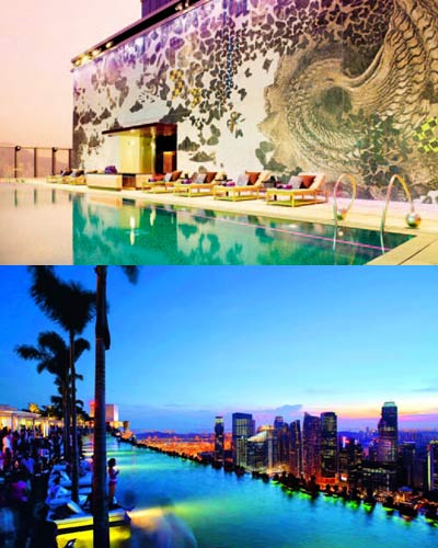 这个室外泳池建在酒店55层高的塔楼顶层,凭借着海拔198米的高度,它已经成为当下世界上最大的室外泳池。如果在这里游泳,会觉得自己将一直游到对面的钢铁丛林中去,甚至有种游进高空的错觉,这是因为泳池采用了一种能让水体看起来仿佛延伸至视野尽头的设计,泳池的边缘被设计在水面之下几厘米处,溢出的水会流到下面的一个集水池,然后再由水泵抽回至我们刚刚游过的那个水池。