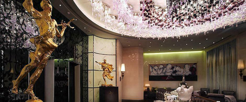 酒店大堂东西方当代艺术大师的真迹会让所有刚刚踏入酒店的人眼前一亮,这里的每件艺术品都前卫突出。其中能带来最大视觉震撼的,当数由著名捷克玻璃艺术家Jitka Skuhravá所制的大型玻璃雕塑灯饰装置艺术《Bubbles in Space》,其浓淡斑驳的紫红色玻璃球使人联想起香槟上升时的泡沫,营造出令人迷醉的气氛。此外,法国画家Jean-Jacques Henner擅长以晕涂法绘画宗教作品和裸体画像,其作品《Salome》也为酒店大堂锦上添花。