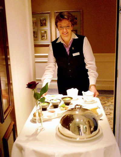 这天我们的客房早餐本来是订的西式早餐,但Rudolph先生说他家的大厨完全可以做中餐,我们好奇心大起,另外加了一份 中式早餐。第二天一早,酒店服务生将餐 车推进来时,真是给了我们一个大大的惊 喜,没想到完全是地地道道的广东早茶格局!看来Rudolph先生不是吹的,这些茶点味道好极了!作为一个在广东生活了几十年的早茶爱好者,我非常负责任地说。
