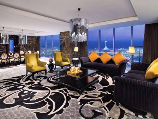 布局:巨大的枝形吊灯从平流的天花板悬垂下来。屋内颜色夺目豪华感十足,有白色、金色还有海军蓝。客厅宽敞,容纳有两个休息区以及一个办公桌、一个餐桌。屋内由木地板铺就,室内装饰雕嵌细致。躺在织锦包裹的沙发上,这间有三个卧室的套房会让你联想到弦乐四重奏、加冕服,让你恍惚其中。