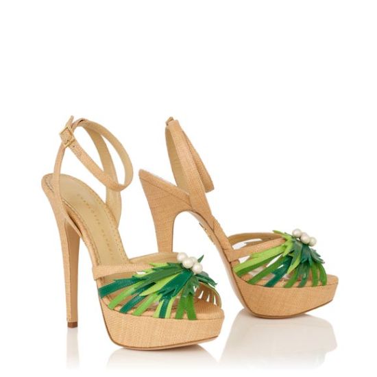 Charlotte Olympia:夺目的Oasis凉鞋鞋面为充满层次感的抽象棕榈叶,并以深浅不一的绿色麂皮和皮革制成;而独家的Palm Pandora时尚手提包,则配以金色棕榈树扣及简约的紫红、黄和绿色酒椰叶装饰。