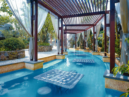 海南岛因为和夏威夷处于同一纬度,所以拥有相似的热带气候和自然景观。和火山活跃的夏威夷一样,这里也同样拥有众多的火上遗迹和丰富的温泉资源。世界第一大水疗温泉度假区—观澜湖海口国际高尔夫度假村就建立在海南岛的万年火山岩地貌之上。度假村由一座18 层度假酒店、9 层副楼,一座楼高3 层的会所、购物中心、宴会厅、康体中心和10 个世界级经典高尔夫球场组成。秉承着“Golf and More”的休闲理念,在这里不但能在世界顶级的球场自如挥杆,体验中式、日式、西式等特色餐厅提供的环球美食,还能在融合了七大洲的设计风格、蕴涵丰富养生矿物元素的冷热温泉中,卸下所有的疲惫。