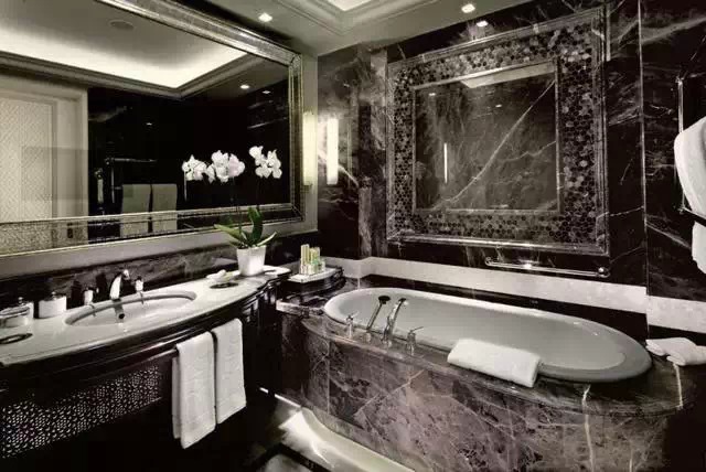 浴室配有恒温地暖,就连马桶都是日本 ToTo 卫洗丽中最顶尖的一款。而客用化妆室里的墙面、天花板和地板则全都铺上了珍贵的虎眼石。