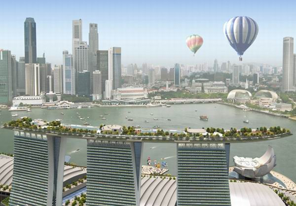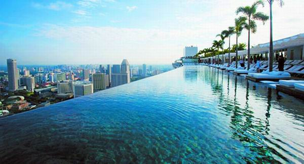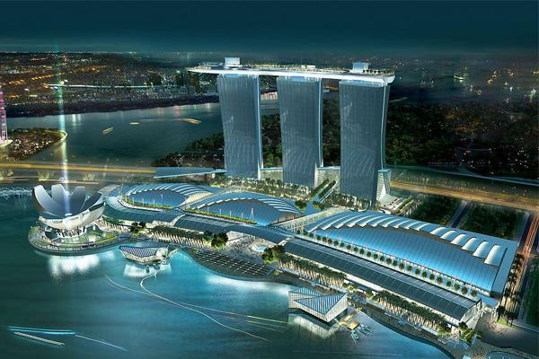 滨海湾金沙酒店是一家耗资50亿美元的综合度假胜地,共有55层,楼顶上还建有一个巨大的泳池。此外还有一条室内运河、一座形似莲花的博物馆、商店、餐馆、剧院、博物馆和赌场。这一设计被一些人描述为由类似顶部设有一个下行甲板的三个板球桩组合而成。