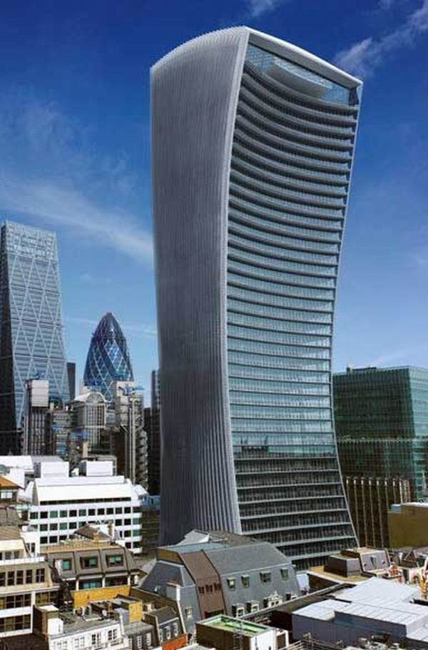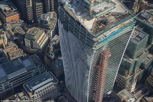 这座被称为“对讲机大厦”的160米高的建筑因其弧形玻璃表面反射的光线后产生聚光效应,所产生的灼热光束反射到街道上将汽车热得快要融化了一般。设计者称目前该问题已被解决。
