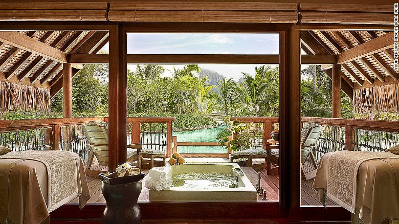 酒店附近就是绿松石泻湖和热带树林,在博拉博拉岛做Spa再完美不过了。而且,它选用塔希提黑珍珠做为磨砂,顾客用的面膜由从深海中采集的有机水藻提纯制成,治疗师皆来自瑞士,采用瑞士标准,一切尽显奢华。客人除了可以在套房中进行水疗外,还可以选择在室外露台进行泡浴。此外,酒店也为13-17岁的孩子提供水疗服务。