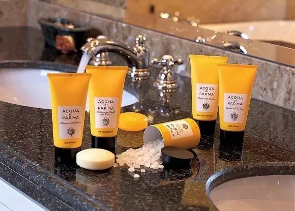必须要重点介绍一下这个牌子。“手工制造”是帕尔马之水的关键词。所有产品都选用纯天然原料限量生产,并严格坚持这一传统。它的酒店线完全忠于最经典的Colonia柑橘清香味道,因此包装也是经典的橘色。其中包括六个规格的不同产品:沐浴露,身体乳,洗发露,护发露各40ml,浴盐和香水皂各50g。