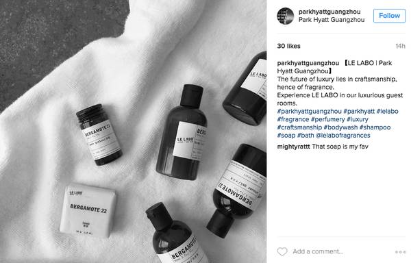 而刚刚提到到还未进入中国市场的Le Labo,也是柏悦旗下的一款浴品,在广州Park Hyatt就能见到。Le Labo为他们调的是22号,可以一试为快!