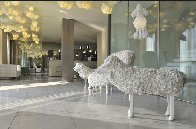 这家意大利公司在成立50年之后终于决定要进军世界奢侈的生活方式酒店,并且野心勃勃,计划着以30个楼盘攻占从巴西到土耳其到阿曼的酒店市场。而设计的最大利器是各式颜色鲜艳,样式深刻的几何图案,餐桌上无数三角折线的桌垫,使营造出摩登时代的晕眩感,配上头顶状若蜘蛛的金属三角支架聚合灯,淡淡的童真童趣将工业产品的冰冷彻底抹去,趣味盎然。