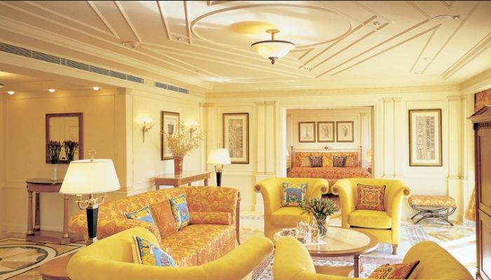 迪拜的酒店元素中独一无二的就是黄金,这家酒店将黄金的细节通过整个天花板来展现,不仅有金光闪闪的奢华,同时也使得生活的空间相对清爽。整个酒店的设计融合了经典的欧洲宫廷风格和阿拉伯王室的元素,兼有的浅色调,把酒店彻底打造成了沙漠中的绿洲。