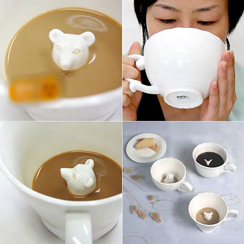 藏着动物的咖啡杯(Hidden Animal Teacups),比常见的马克杯要大很多,捧在手中很有份量。共有3款,每款杯子的底部都藏着一只可爱的小动物,有熊、狐狸和猫头鹰。随着咖啡慢慢被喝完,小动物会探出脑袋,直到露出全身,简直可爱极了。这样,就算一个人喝咖啡也不会寂寞了,你看,熊熊在向你说Hello呢~
