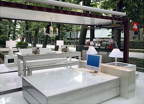 在第52届威尼斯双年展期间,著名的咖啡品牌 - illy公司向众人展示了一间具有未来气息的便利咖啡屋。在一个看似废旧的集装箱旁,只需轻轻地触动按钮,这个箱子就会出人意料地变成一座功能集全,装修精致的咖啡屋。真是太神奇了,唯一的缺点,就是整座咖啡屋都是露天的,连洗手间也不例外。另外一个B.H比较担心和不解的问题是,在它变回集装箱时,马桶里的水会不会倒流出来?