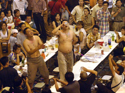 在中国的青岛国际啤酒节上,脱掉你的衣服,像图中所示的中国人一样站在桌子上参加喝啤酒大赛吧。这个为期17天的啤酒节每年都会举行,是仿照德国啤酒节而举办的。这个啤酒节吸引了无数的当地人和外国游客前来,还有来自欧洲和美国的厂商。青岛啤酒是中国首屈一指的啤酒制造商,它是在1903年由一位德国流亡者创办的。