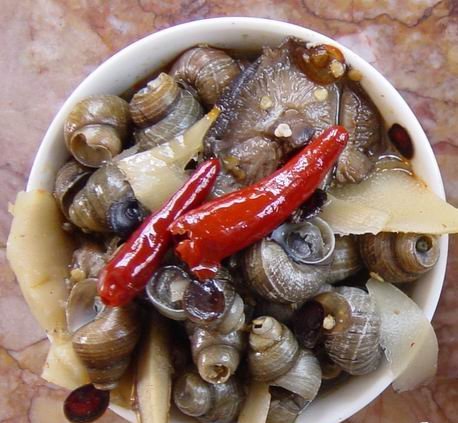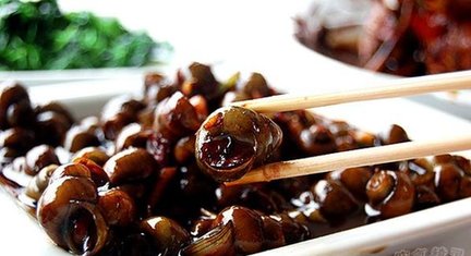 2、锅中放油用葱段、姜片煸香放入田螺喷入黄酒,加酱油、糖、胡椒粉、鲜汤烧开后撇去浮沫,转小火煨烧至酥,开大火收汁至稠,淋上麻油即成。