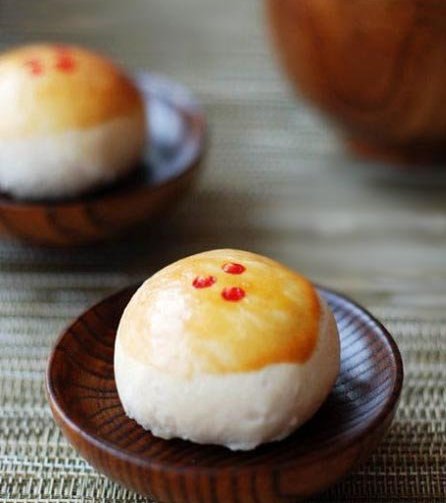 9、依次将所有面团包好,用手轻轻压扁,用毛刷沾蛋黄液,在包好的月饼坯子上刷上一层,再用一只筷子粘少许食用红色素点几点红点(你也可以用黑白芝麻做装饰,或者干脆什么也不刷不放),然后,入烤箱中层烘烤25-30分钟即可。