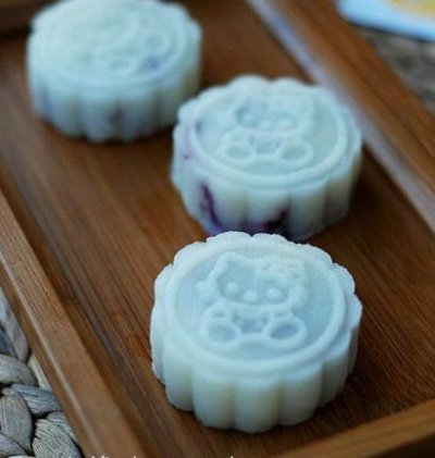 冰皮月饼粉200克、紫薯两只(可以用红薯或者南瓜代替,或者直接用其它月饼馅)、猪油(月饼皮用,换成植物油的话油量要适当减少)40克、凉开水100克,黄油30克(紫薯馅用)、糖适量(紫薯馅用)