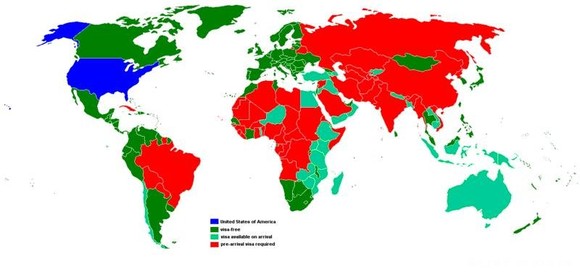 美国护照(深绿色免签,浅绿色落地签,红色要预先办理签证)~恩,好红 啊,为了防止政治威胁,绝对要对它签证。